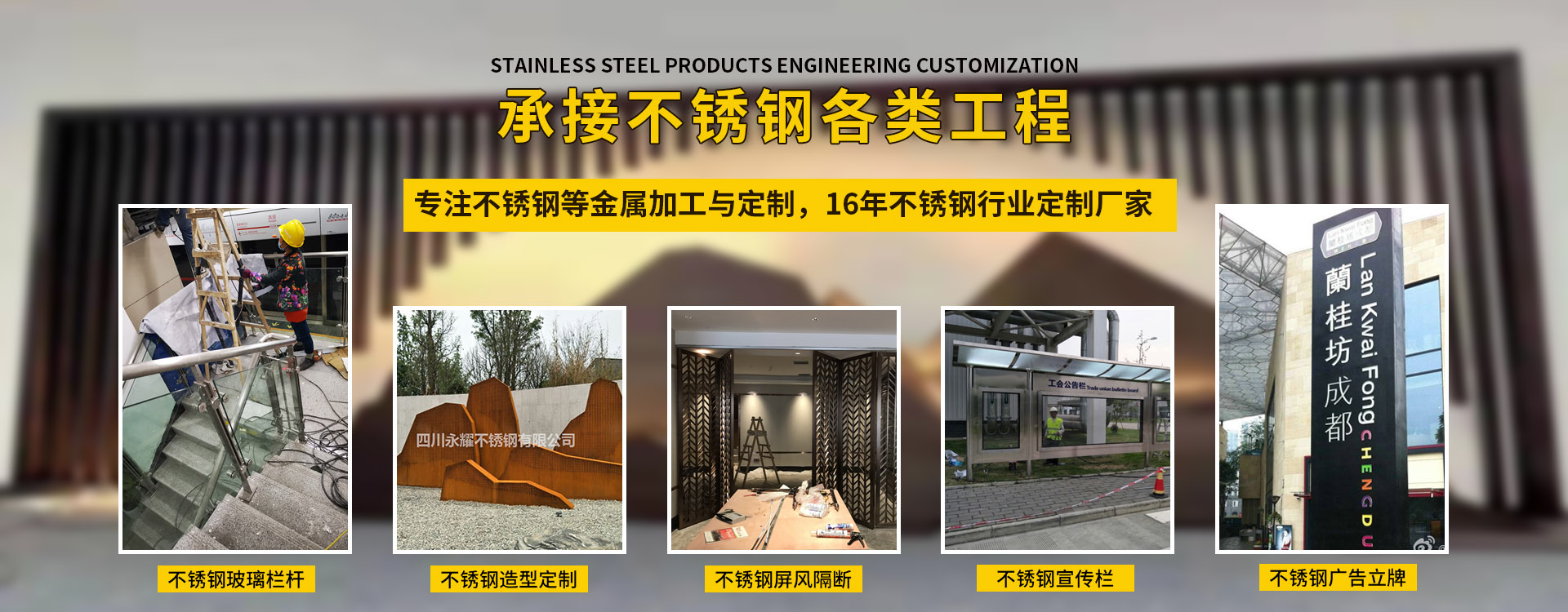 四川永耀不銹鋼有限公司是一家集開(kāi)發(fā)、設(shè)計(jì)、加工、制作、安裝、并承接各種不銹鋼工程為一體的綜合性企業(yè)。多年來(lái)一直在專注于不銹鋼等金屬的加工與研發(fā)。在客戶群體中贏得了良好的聲譽(yù),以專業(yè)專注的精神,致辭力于打造良好的產(chǎn)品和企業(yè)形象,對(duì)每一產(chǎn)品傾注全力,力爭(zhēng)每個(gè)細(xì)節(jié)精細(xì),確保產(chǎn)品具有優(yōu)越的性能,優(yōu)美的外觀及優(yōu)良的品質(zhì),使公司產(chǎn)品深受廣大用戶的親睞。 本公司主要業(yè)務(wù): 一、工程類 承攬:酒店、銀行、商鋪、寫(xiě)字樓、公寓、城鐵、地鐵、公交、機(jī)關(guān)、 學(xué)校、廣場(chǎng)藝術(shù)雕塑、自動(dòng)門、旋轉(zhuǎn)門、廣告欄、公